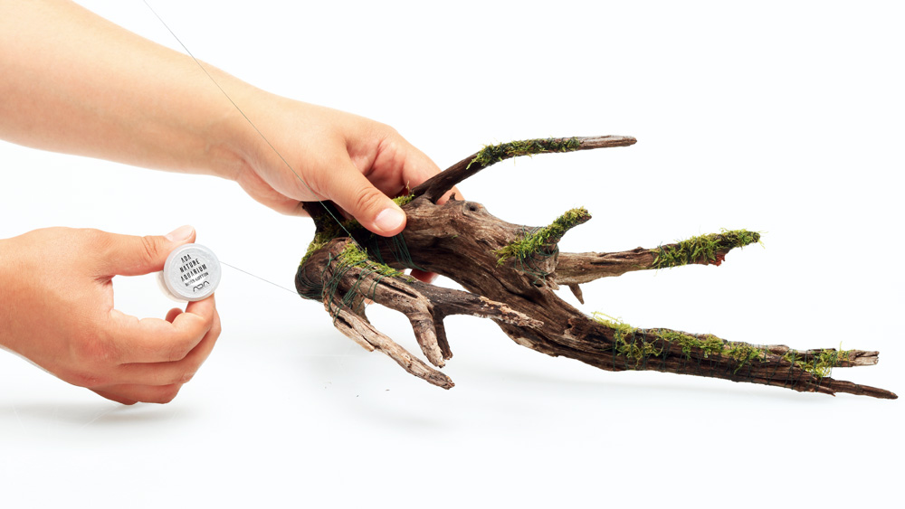 モスは流木の表面に薄く広げて、 モスコットンで巻き付けていきます。