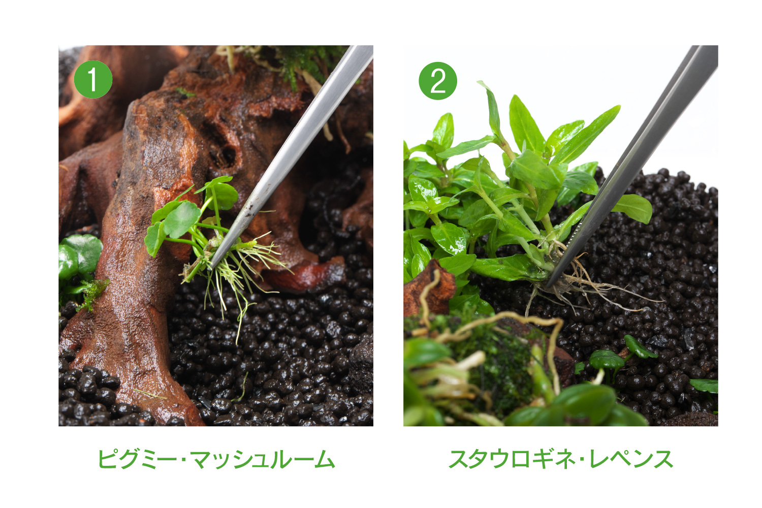3種類の水草を1カップずつ使用しアクアピンセットMで植栽。植栽前に底床に霧を吹き湿らすと作業がしやすくなります。