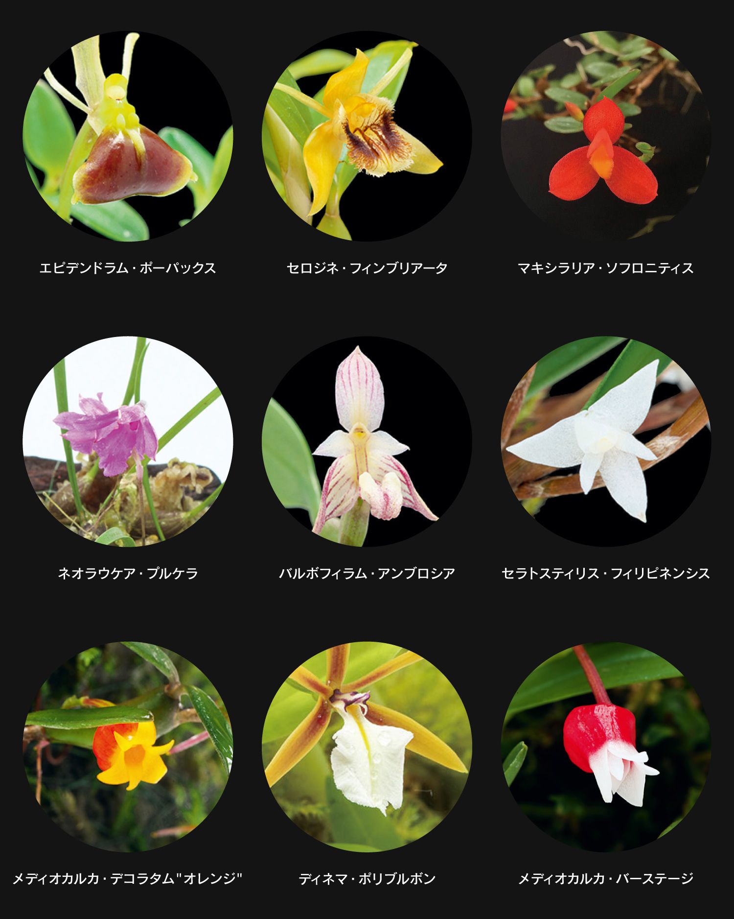 ADAで扱う着生ランの現在のラインナップは冬に咲く種類が多く、現在はディネマ・ポリブルポンやメディオカルカ・バーステージーが花盛りです。花の形や色合い以外にも、葉の形状も選ぶポイントになります。今後、春から夏の間で開花を楽しめる種類も販売を予定しています。